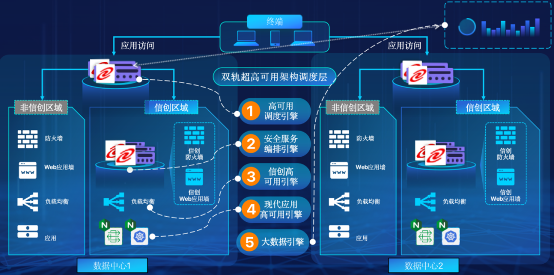 雙軌超高可用架構(gòu)擁有五大引擎,分別是:高可用調(diào)度引擎、安全服務(wù)編排引擎、現(xiàn)代應(yīng)用高可用引擎、信創(chuàng)高可用引擎、大數(shù)據(jù)引擎,可以幫助客戶在新架構(gòu)下, 提升應(yīng)用可持續(xù)性,解決性能瓶頸,提升穩(wěn)定性。在服務(wù)異常情況下,可以通過實時灰度調(diào)度的方式,實現(xiàn)業(yè)務(wù)的應(yīng)急逃生,保留應(yīng)用故障現(xiàn)場環(huán)境,便于后續(xù)的排錯與根因定位。